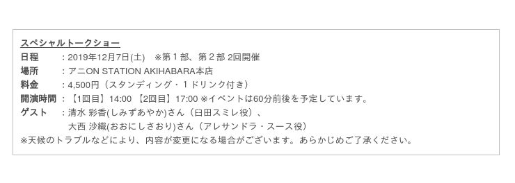 声優キャスト2名が出演するトークショーを2019年12月7日(土)に開催します。こちらはニコニコ生放送でも一部放送予定です。