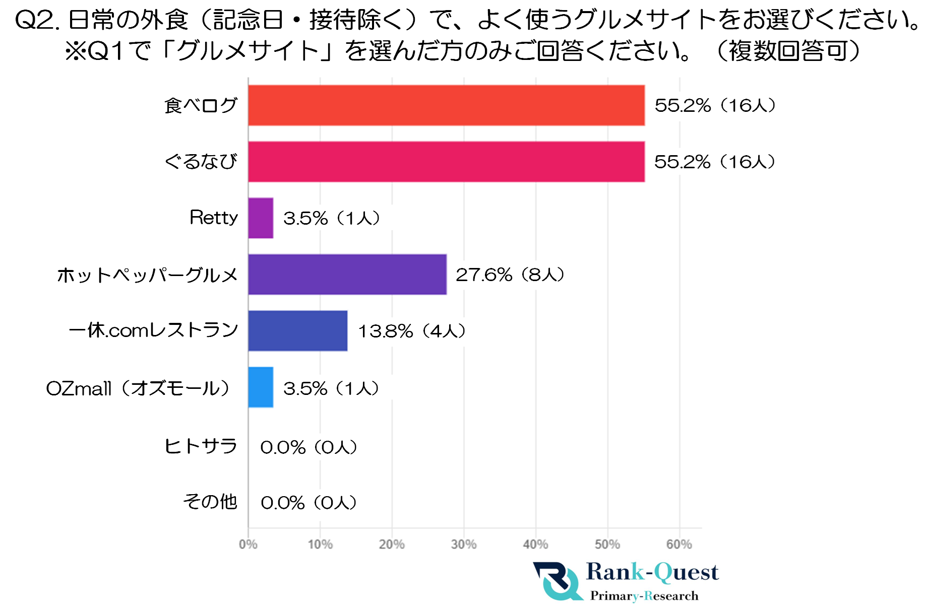 - 一方で、「Retty」と「OZmall(オズモール)」はいずれも3.5%(1人)にとどまり、実名口コミや編集コンテンツといった特徴はあるものの、利用層は限定的なようです。