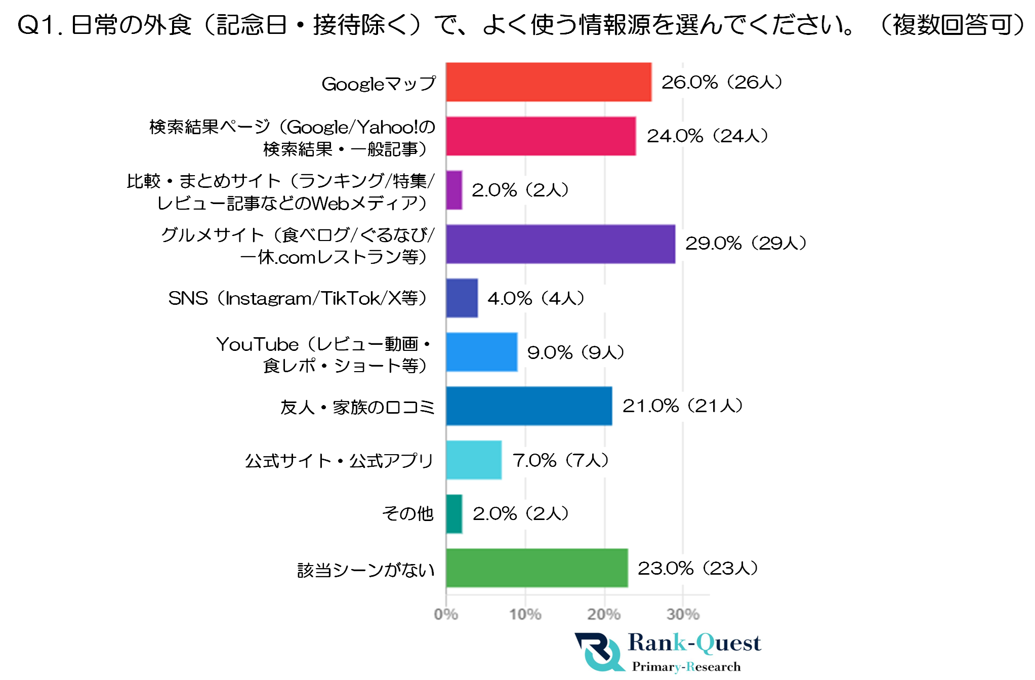 - 最も多かったのは「グルメサイト(食べログ、ぐるなび、一休.comレストラン等)」で、29.0%(29人)が選択しています。口コミや評価を参考に飲食店を比較・検討する人が多く、信頼性を重視して選ぶ傾向が見られます。