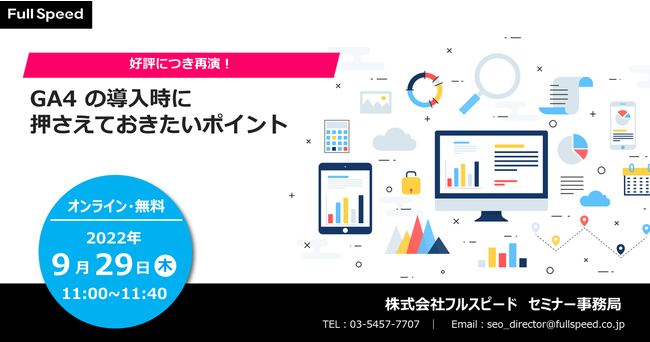GA4 の導入時に押さえておきたいポイント 」と題した無料オンラインセミナーを、2022年9月29日(木)に開催いたします。本セミナーは2022年8月25日に開催したセミナーの再演となります。 お見逃しの方だけでなくもう一度ご覧になりたい方も、ぜひお気軽にご参加ください。