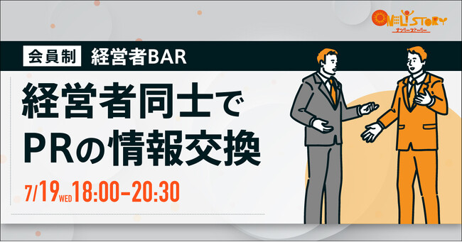 審査制・決裁者マッチングプラットフォーム「ONLY STORY」「チラCEO」(サービスサイト:https://onlystory.co.jp/service/ )を運営する株式会社オンリーストーリー(代表取締役:平野哲也、本社:東京都渋谷区)は、7月19日(水)18:00-20:30 に経営層限定・BAR貸切交流会を実施します。PRに関心がある経営者向けに開催し、互いに情報交換ができる場として開催します。
