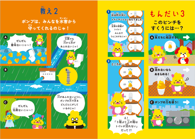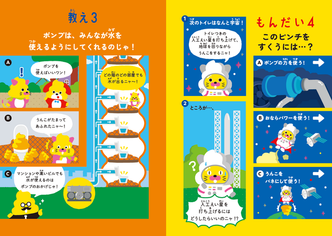 冊子の内容はクイズ形式で全5問。うんこねこがいろんなところにトイレを作るストーリーが展開します。クイズの設問や選択肢には、うんこドリルでおなじみの「うんこ」というキーワードやイラストが散りばめられており、子どもの興味関心を強く惹きつけます。山の上にトイレをつくったり、町の中にトイレマンションを建てたり、トイレ付きの人工衛星を打ち上げるシーンの描写をつうじて、低いところから高いところへ水を運べることや、マンションや高いビルでもみんなが水を使えること、さらにはロケットのエンジンに燃料を送るポンプのことまで、私たちの暮らしを支えるポンプの役割が、クスッと笑いながら学べる仕組みになっています。