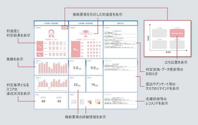 本ソリューションは、企業が求める人財定義から、現場部門の課題に即したスキルや特性の設定、社員の評価の視える化・教育プランのレコメンドまで、職種に応じた人財育成を支援します。導入企業の社員は、実績や保有資格などの定量評価と、企業理念に基づき活動しているかを測る定性評価による多面的な軸で、自身のプロフェッショナル人財としてのレベルを確認し、スキルアップにつながる教育プランのレコメンドなどを受けることができます。