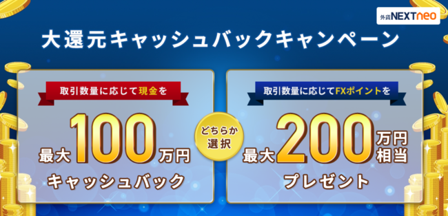 対象期間中の『外貨ネクストネオ』における指定通貨ペアの新規注文の取引量に応じて、最大200万円相当のFXポイント、もしくは現金100万円のキャッシュバックをいたします。