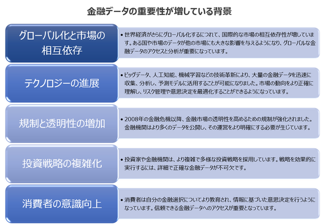これらの要因により、金融データは経済のさまざまな側面において中心的な役割を果たし、その重要性は今後も増していくことが予想されます。