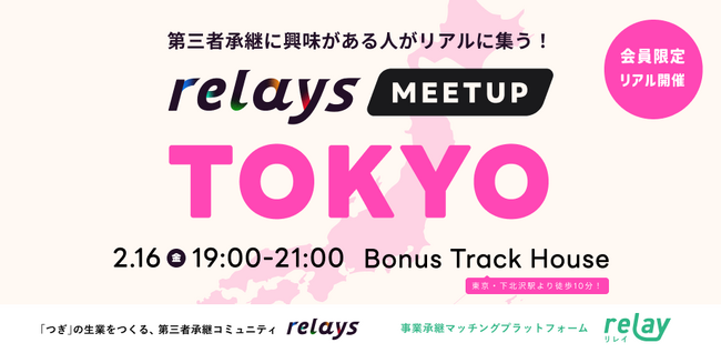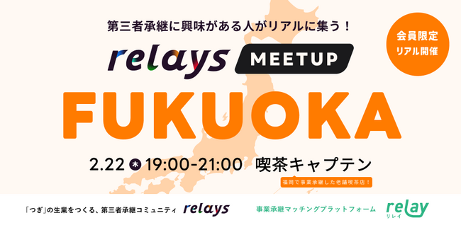 日本初!第三者承継コミュニティ「relays(リレイズ)」、事業承継で地域を明るくしたい人々がリアルに集う「relays MEETUP」を東京(2月16日)・福岡(2月22日)の2箇所で開催決定!