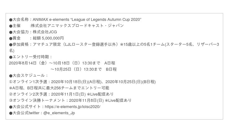 株式会社アニマックスブロードキャスト・ジャパン(以下、アニマックス、本社:東京都港区、代表取締役社長:滝山雅夫)が運営するアニメ専門チャンネル<アニマックス>は、eスポーツ新規プロジェクト「e-elements (イーエレメンツ)」 (以下、e-elements) の第一弾として主催する “League of Legends Autumn Cup 2020”の大会賞金の詳細を決定いたしました。