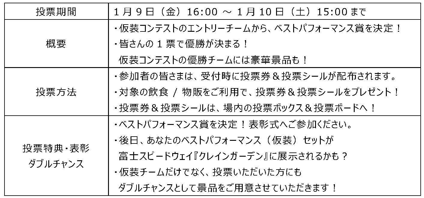 また、投票用のシールに付属する抽選券にチーム名を記載いただき、投票ボックスへ入れていただいた中から、ダブルチャンスとして投票いただいた方にも景品をご用意いたしますので、どしどし投票をしていただきますようお願いいたします。