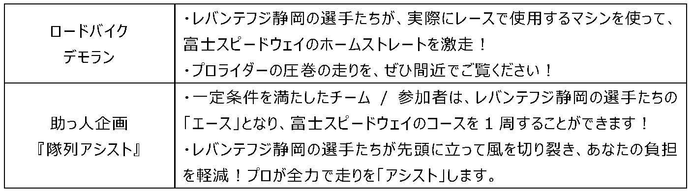 富士スピードウェイの地元・静岡を拠点とするプロサイクルロードレースチーム、「レバンテフジ静岡」の選手がご来場!迫力あるプロライダーのデモンストレーション走行や助っ人企画『隊列アシスト』、トークショーなどで会場を盛り上げます。