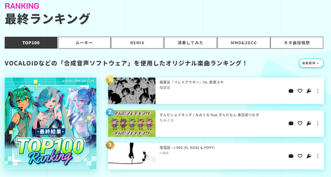 (対象カテゴリ:「TOP100」「ルーキー」「ルーキー」「ネタ曲投稿祭」)