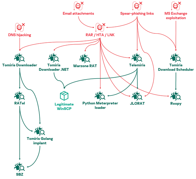 Tomirisはさまざまな攻撃経路を使用して被害者を狙っています。悪意のあるコンテンツ(パスワードで保護されたアーカイブ、悪意のある文書、兵器化されたLNK形式ファイル)が添付されたスピアフィッシングメール、DNSハイジャック、脆弱(ぜいじゃく)性の悪用(特にProxyLogon)、疑わしいドライブバイダウンロードほか、新しい手段もあります。