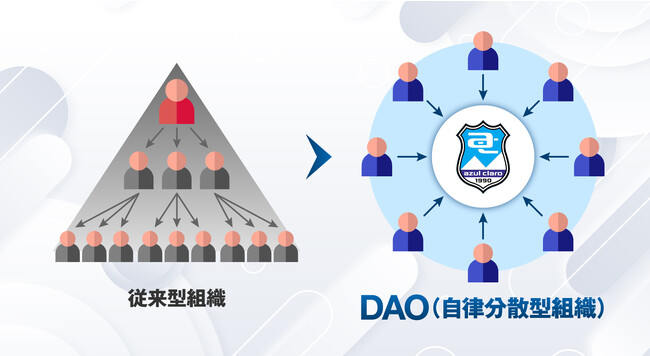 "自律分散型組織"と呼ばれ、ビジョンに賛同する人々が協力して、自律的に運営されるコミュニティのことです。組織内の活動は公開・可視化され、メンバーによる投票等によって意思決定が行われます。しかし、現在のDAOは実験段階のものも多いため「アスルクラロDAO」では、開始当初はクラブがDAOを主導していきます。