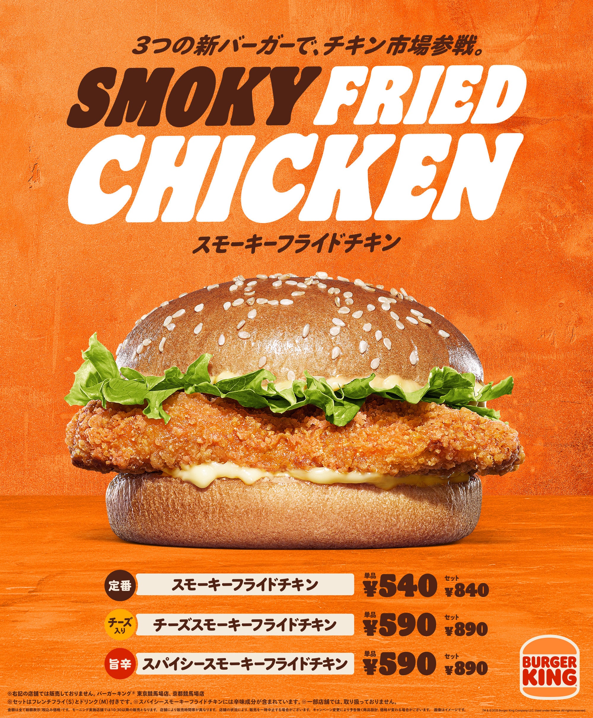 バーガーキング(R) ファンの皆様も、チキンバーガーファンの皆様も、ヒッコリーのスモーキーな香りと7種類のスパイスを使用した新開発チキンパティをサンドした『スモーキーフライドチキン』『チーズスモーキーフライドチキン』『スパイシースモーキーフライドチキン』3商品をぜひお楽しみください。