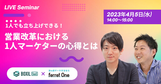 BtoBマーケティングのお困りごとをまるっと解決するサービス『ferret One(フェレットワン)』を運営する株式会社ベーシック(本社:東京都千代田区、代表取締役:秋山勝、以下「当社」)は、スマートキャンプ株式会社(本社:東京都港区、代表取締役社長CEO:林詩音、以下「スマートキャンプ社」)と、4/5(水)14時より、マーケティングリソースが少なく成果創出に悩まれているマーケティング担当者やセールス担当者に向けたセミナー「1人でも立ち上げできる!営業改革における1人マーケターの心得とは」を開催いたします。