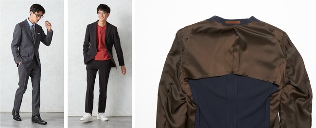 今回のオンラインショップ限定スーツは動きやすい仕様にこだわり、背中部分の裏地のゆとりを広げました。シルエットはそのままに背中裏地のキセを当社従来品のオンラインショップ限定スーツの2倍の3cmにすることで背中周りが突っ張りにくく表地のストレッチ性を活かし、肩回りの動きをラクにしました。