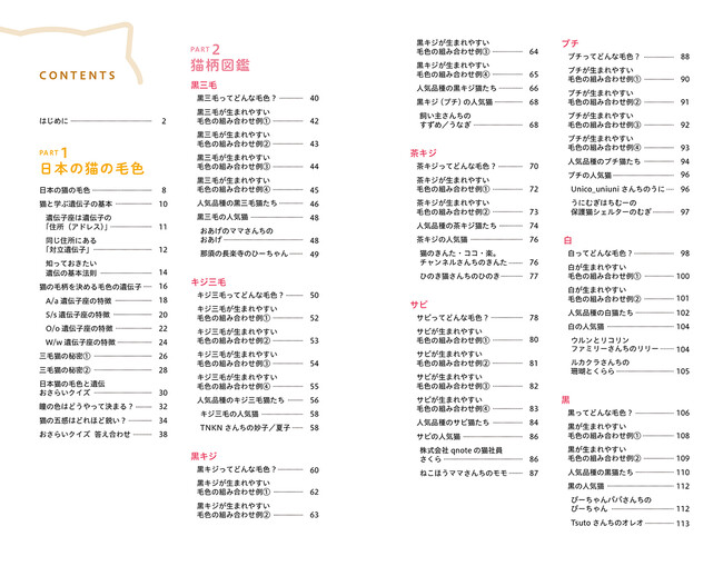 黒三毛、キジ三毛、黒キジ、茶キジ、サビ、ブチ、白、黒の毛柄を豊富なデータとともに、にゃんこの模様のふしぎを徹底解明。YouTube&SNSで人気の猫たちや、ねこ博士&猫教授の愛猫も登場します!
