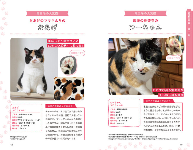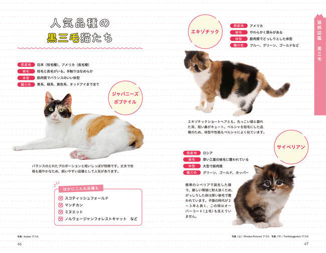 身近な日本の猫たちを中心に、柄ごとの特性の違いや、猫の五感、猫観察のすすめも盛り込んでいます。