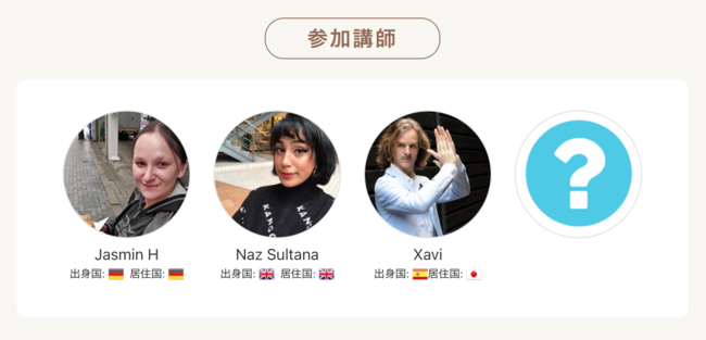 ゲスト講師はドイツ、イギリス、スペイン、台湾から4名をお招きします。