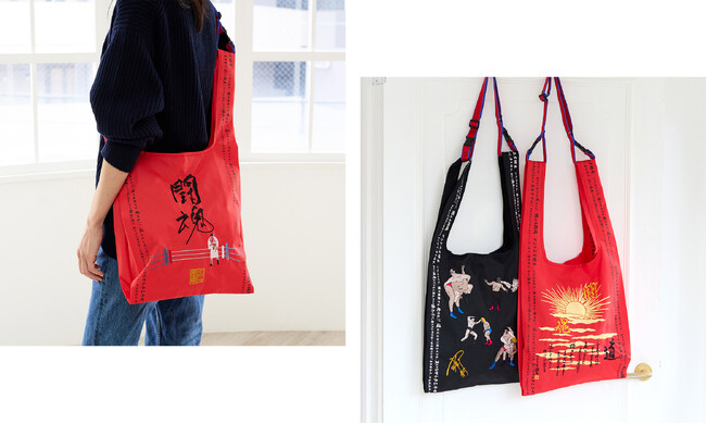 直筆サインを大胆に刺繍したトートバッグは目を引くレッドカラーベース。リング場での後ろ姿も表現しています。ファイトシーンや名言を刺繍したバッグもインパクト抜群です。