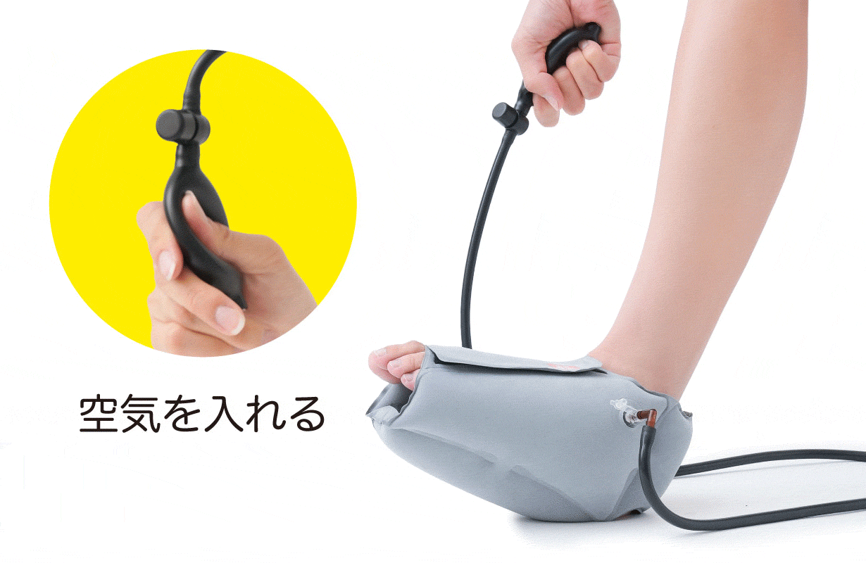 足にサッと巻いて、ポンプで空気を注入し、ボタンを押すだけで簡単に空気が抜けます。