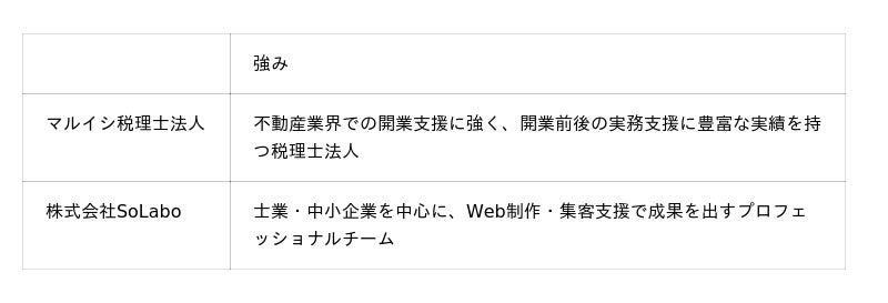 株式会社SoLabo(本社:東京都渋谷区、代表取締役:田原 広一)は、不動産業での独立・開業を検討する事業者向けに、マルイシ税理士法人(本店:東京都新宿区、代表社員 税理士 石渡 芳徳 / 代表社員 税理士 藤井 幹久)と不動産事業開業支援サービスにおける業務連携を開始いたしました。SoLaboは、士業・中小企業支援領域においてWeb制作・集客支援でトップクラスの実績を持ちます。本連携により、税務・融資・開業手続きに加え、開業後すぐに動き出すためのWeb集客までを含めた、実践的かつ一気通貫の不動産事業開業支援を提供します。