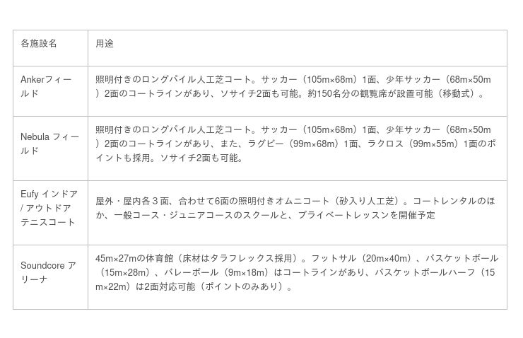 なお、川崎市民の皆様に喜ばれるスポーツ施設として、誰もがスポーツに気軽に触れられる場とコンテンツを提供していく他、災害時には隣接する生田ふれあい広場・生田多目的広場を中心に、市民の安心・安全を守る一時避難場所や災害対応業務のための拠点となる予定です。施設内では市民の皆様が使用できるスタジオにてSoundcoreのスピーカーやNebulaのスマートプロジェクターが採用される他、来場された方が自由に使えるAnkerの充電スポットも設置します。様々なAnkerグループ製品やイベントを通じて、アンカー・ジャパンを身近に感じていただきながら、皆様の楽しみと安心に繋がる活動ができるよう力を入れて参ります。