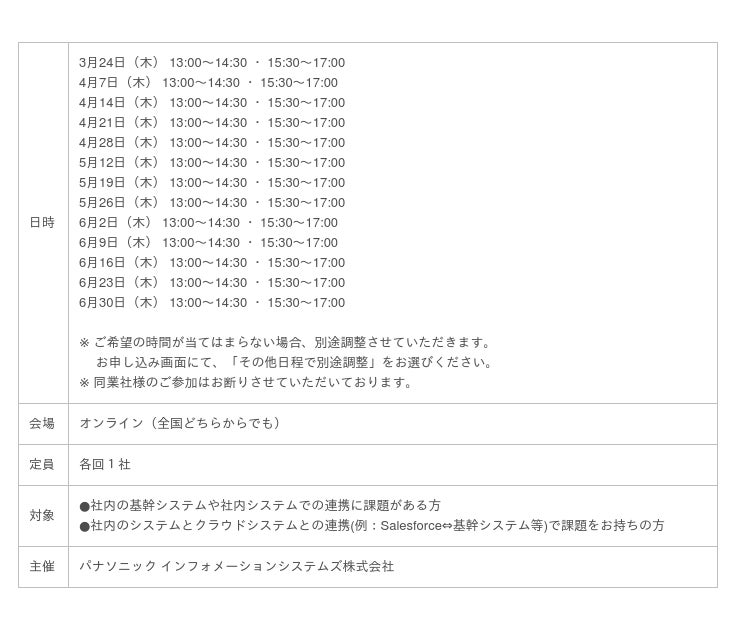パナソニック インフォメーションシステムズ株式会社は、 2022年3月24日(木)から2022年6月30日(木)にかけて各回1社限定の、情報システム部門様向け システム連携 オンライン個別相談会を実施します。 ※好評につき期間延長しました。