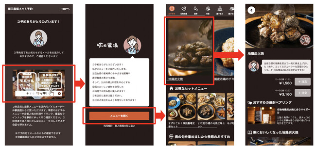 本サービスは、塚田農場オウンドサイトを通じてネット予約した際に、予約完了画面から実際のモバイルオーダーシステム(「トレタO/X」)と同様の操作が可能なデモページに遷移することで、モバイルオーダーシステム内のリッチな動画や画像等を通じて、塚田農場の特色や詳細なメニュー情報を確認することができるとともに、注文の操作体験が可能です。