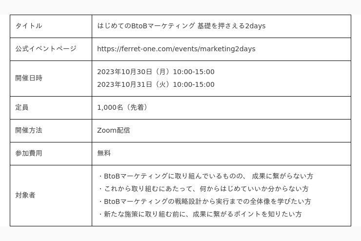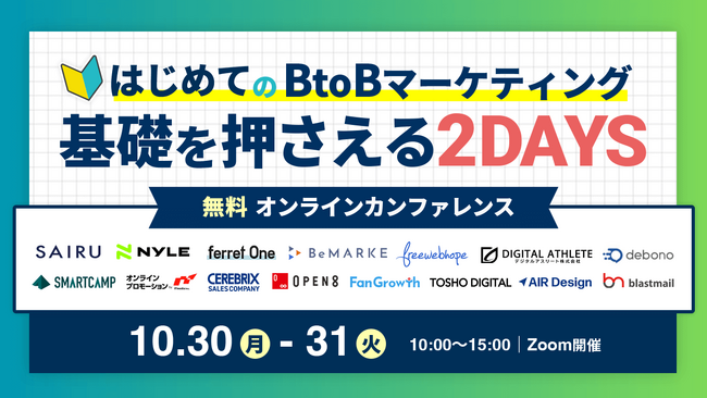 BtoBマーケティングのお困りごとをまるっと解決するサービス『ferret One(フェレットワン)』を運営する株式会社ベーシック(本社:東京都千代田区、代表取締役:秋山勝、以下「当社」)は10/30(月)・31(火)10:00~15:00に「はじめてのBtoBマーケティング 基礎を押さえる2days」を開催いたします。