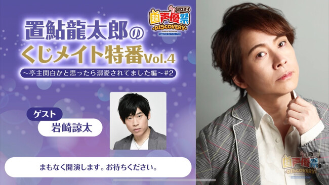 本レポートでは、ニコニコ生放送で2024年4月22日(月)20時に配信された置鮎がMCを務める番組『置鮎龍太郎のくじメイト特番Vol.4〜亭主関白かと思ったら溺愛されてました編〜#2』の模様をお届けします。同番組は、ドワンゴが販売するアニメイトのオンラインくじサービス「くじメイト」にて、『SLAM DUNK』三井寿役、『トリコ』トリコ役、『BLEACH』朽木白哉役などを務める声優・置鮎龍太郎のくじが現在発売中であることを受けて放送する特別番組。今回、ゲストに声優の岩崎諒太を迎え、ダミーヘッドマイクによる生収録や二人が出演する舞台『悪魔の手毬唄』の見所を仲良く解説するなど、和気あいあいとした特番となりました。