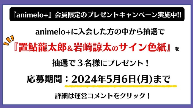 animelo+のチャンネル会員限定で、置鮎龍太郎、岩崎諒太のサイン入り色紙を抽選で3人にプレゼント。