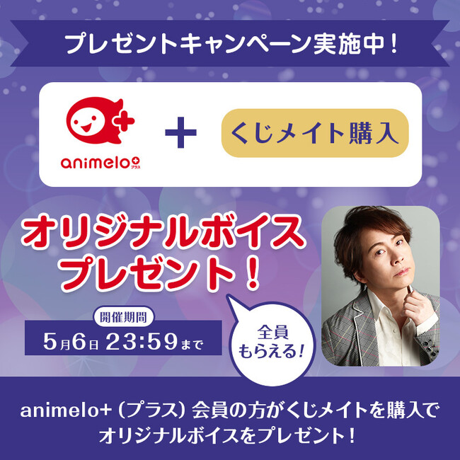 くじメイト注文時に【キャンペーン欄へニコニコID】を記入すると、animelo+会員限定で置鮎龍太郎のオリジナルボイスを1種プレゼント。こちらもお見逃しなく。