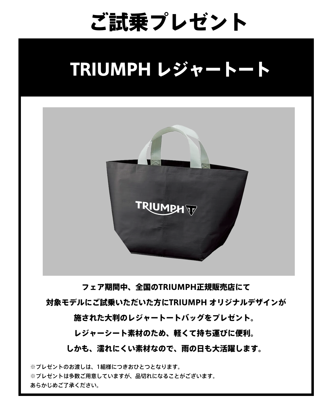 期間中、対象モデルの試乗予約をし、全国のTRIUMPH正規販売店にてご試乗された方に、「TRIUMPH レジャートート」をプレゼントいたします。