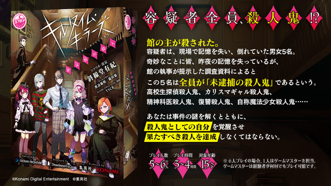 株式会社コナミデジタルエンタテインメントは、IP創生プロジェクト「ヨフカシプロジェクト」の第3弾となるボードゲーム『キルタイム・キラーズ 絶泉館の殺人』の発売(2022年7月予定)が決定したことをお知らせします。『キルタイム・キラーズ 絶泉館の殺人』は、「ヨフカシプロジェクト」の3社(株式会社コナミデジタルエンタテインメント、株式会社オーシャンフロンティア、株式会社ドロッセルマイヤー商會)に、株式会社集英社を新たに迎え、共同開発をした商品です。
