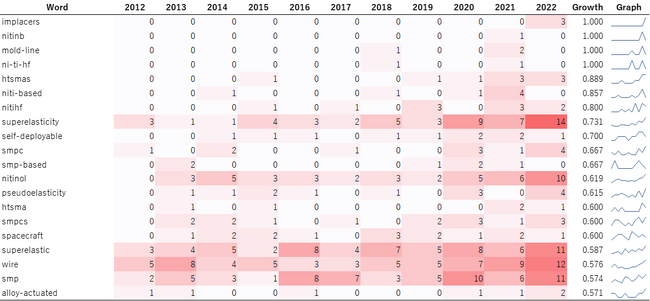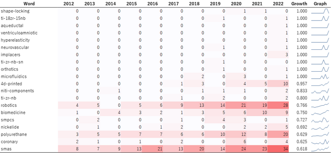 図2から、「ti-18zr-15nb」、「ti-zr-nb-sn」、「ti-zr-nb」などの生体適合性を示す具体的な物質名のキーワードや「aqueductal(stenoses)」、「ventriculoamniotic」、「neurovascular」、「orthotics」、「coronary(stents)」などの具体的なメディカル領域の応用先のキーワードが見受けられ、材料特性の向上に関する論文や新たな応用を模索する論文が今も出版されていることが分かります。このことから、決して新しくはない形状記憶合金/素材×メディカル領域は現在進行形で精力的に研究されている分野であることが明らかです。