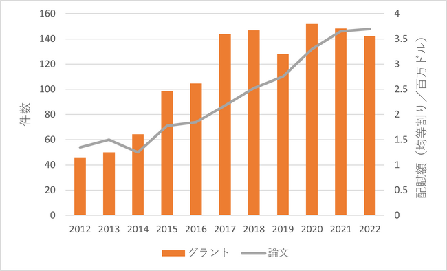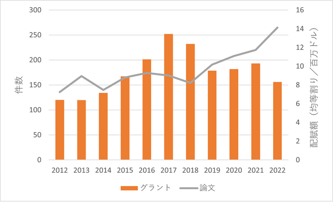 図1から、グラントの配賦額には明確な増加傾向が見られないことがわかります。むしろ、2016年〜2018年に一時的なピークをむかえたと言えるでしょう。一方、論文の件数はゆるやかな増加傾向を示しています。2022年の件数は2012年の件数の約2倍となっています。これは、グラントを通じた資金投資が時間差で論文として成果を挙げていると解釈することも可能です。