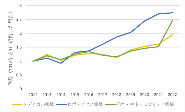 図3から、2017年〜2018年の時期を境に、グラントの配賦額は増加傾向から停滞傾向に転じていることが明らかです。一方で、論文の件数は明確な増加傾向を示しています。2022年の件数は2012年の件数の約2.7倍となっています。形状記憶合金/素材×メディカル領域と同様に、グラントを通じた資金投資が時間差で論文として成果を挙げていると解釈することが可能です。