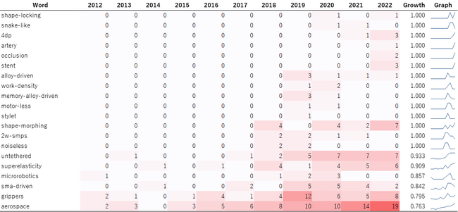 図4から、「snake-like」、「noiseless」、「untethered」などのロボットの具体的な性質を記述するキーワードや「artery」、「(vascular)occlusion」、「stent」、「stylet」などの具体的なメディカル領域の応用先のキーワードが見受けられ、ロボットを医療機器として用いる方法を模索する論文が顕著です。ここから、形状記憶合金/素材×ロボティクス領域がメディカル領域と非常に深い関係にあることが分かります。