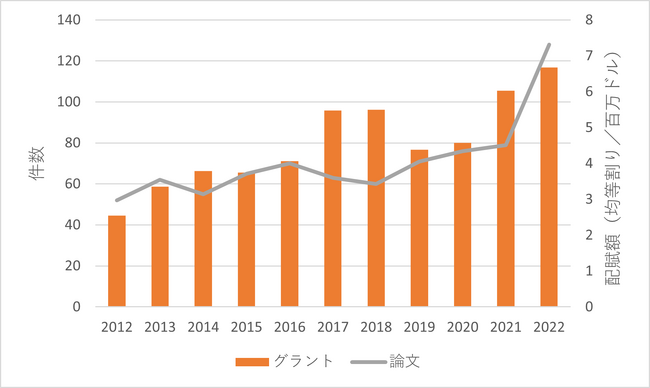 図5から、論文件数やグラント配賦額は緩やかな増加傾向を示していることが分かります。特に、論文件数は、2022年は2012年の約2.5倍となっています。これは、グラントを通じた継続的な資金投資が論文として成果を挙げていると解釈するのが自然です。