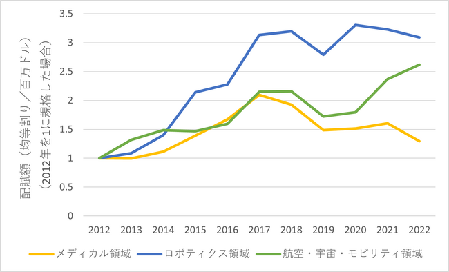 それぞれの領域において、2017年以降にグラント配賦額が増加から停滞傾向に転じる一方、論文件数は緩やか増加傾向を示しています。実際、論文件数は現在も増え続けており、2022年は2012年の約2倍〜2.7倍となっています。これは形状記憶合金/素材の領域全体において、グラントを通じた資金投資が論文として時間差で成果を挙げていると解釈するのが自然です。