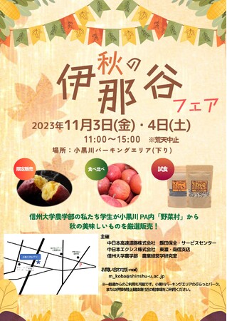 NEXCO中日本 名古屋支社 飯田保全・サービスセンター(長野県飯田市、所長・藤野(ふじの) 友裕(ともひろ))、中日本エクシス株式会社 東濃・南信支店(岐阜県恵那市、支店長・高野(たかの) 智治(ともはる))および信州大学農学部(長野県上伊那郡南箕輪村、学部長・米倉(よねくら) 真一(しんいち))は、地域連携事業の一環として、伊那谷の農林産物の消費拡大や観光客の増加を図り、農村振興を目的とした共同研究を進めてきました。これに伴い、E19 中央自動車道(中央道)小黒川(おぐろがわ)パーキングエリア(PA)(下り)で地域連携イベントを開催します。