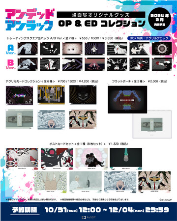 株式会社ディ・テクノ(本社:東京都中央区 代表取締役社長:市原高明)は2023年10月31日(火)より、TVアニメ『アンデッドアンラック』場面写を使用したオリジナルグッズの予約受付を開始いたしました。