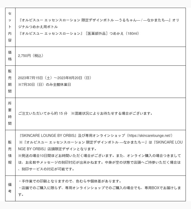 【NEWS1】『オルビスユー エッセンスローション』のオリジナルLOVOTデザインボトル2種を販売