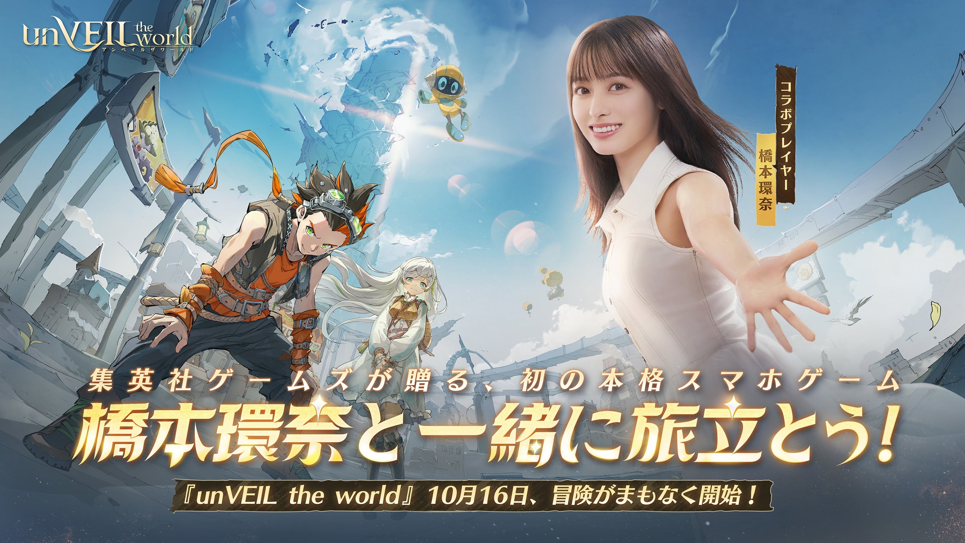 日本の人気女優・橋本環奈さんとのスペシャルコラボレーションが実現。橋本さんは『unVEIL the world -アンベイル ザ ワールド-』の“コラボプレイヤー”として、世界の真実を解き明かす冒険の旅に出発します。橋本さんは日本の数々の作品でヒロインを演じてきた実績を持ちます。今回、集英社ゲームズ初の本格スマホゲームとのコラボを通じて、「キャラクターを演じる」立場から、「ゲームのプレイヤーとしてユーザーを導く」という新たな一面を見せてくれます。Web CMでは、彼女の活力あふれる語り口と豊かな表情で、新たな世界の幕開けを飾り、プレイヤーを冒険の舞台へと誘います。