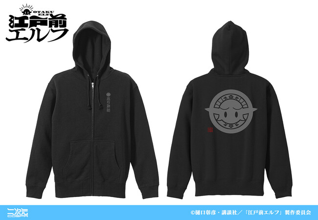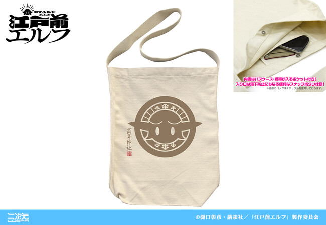 その「高耳神社」の社紋をデザインした、Tシャツ、パーカー、トート、参拝記念タオル、ブックカバーなど『江戸前エルフ』の世界を楽しめる新作グッズがラインナップ。