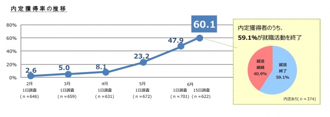 1社以上の内定を獲得した学生は、60.1%となった。6月1日調査から、半月で12.2ポイント増加。内定獲得者のうち、59.1%が就職活動を終了。