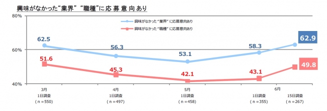 興味がなかった“業界”や“職種”に応募しようと考えている学生の割合は、3月以降減少傾向にあったが、6月1日時点で増加に転じ、6月15日時点では、その割合はさらに増加した。