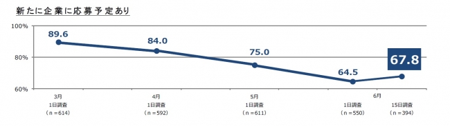 今月、新たに企業に応募する予定がある学生は、就職活動中の学生の67.8%。新たに企業に応募する学生の割合は、3月以降減少傾向にあったが、6月15日時点で初めて増加に転じた。
