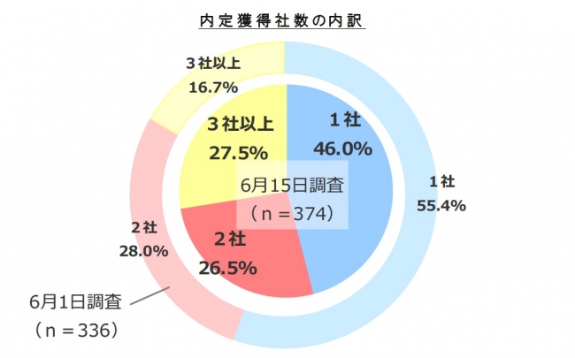 「1社」が46.0%で最多となったものの、「2社」26.5%、「3社以上」27.5%となり、複数の内定を獲得している学生は54.0%で半数を超えた。複数内定獲得者は、半月で9.3ポイントの増加。