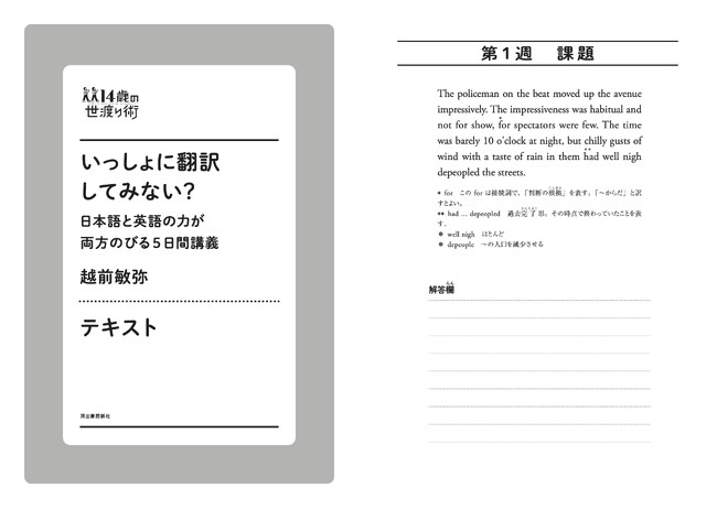 株式会社河出書房新社(本社:東京都渋谷区 代表取締役:小野寺優)は、YA向けの人気シリーズ「14歳の世渡り術」最新刊、越前敏弥著『いっしょに翻訳してみない?──日本語と英語の力が両方のびる5日間講義』を2024年4月24日に発売します。